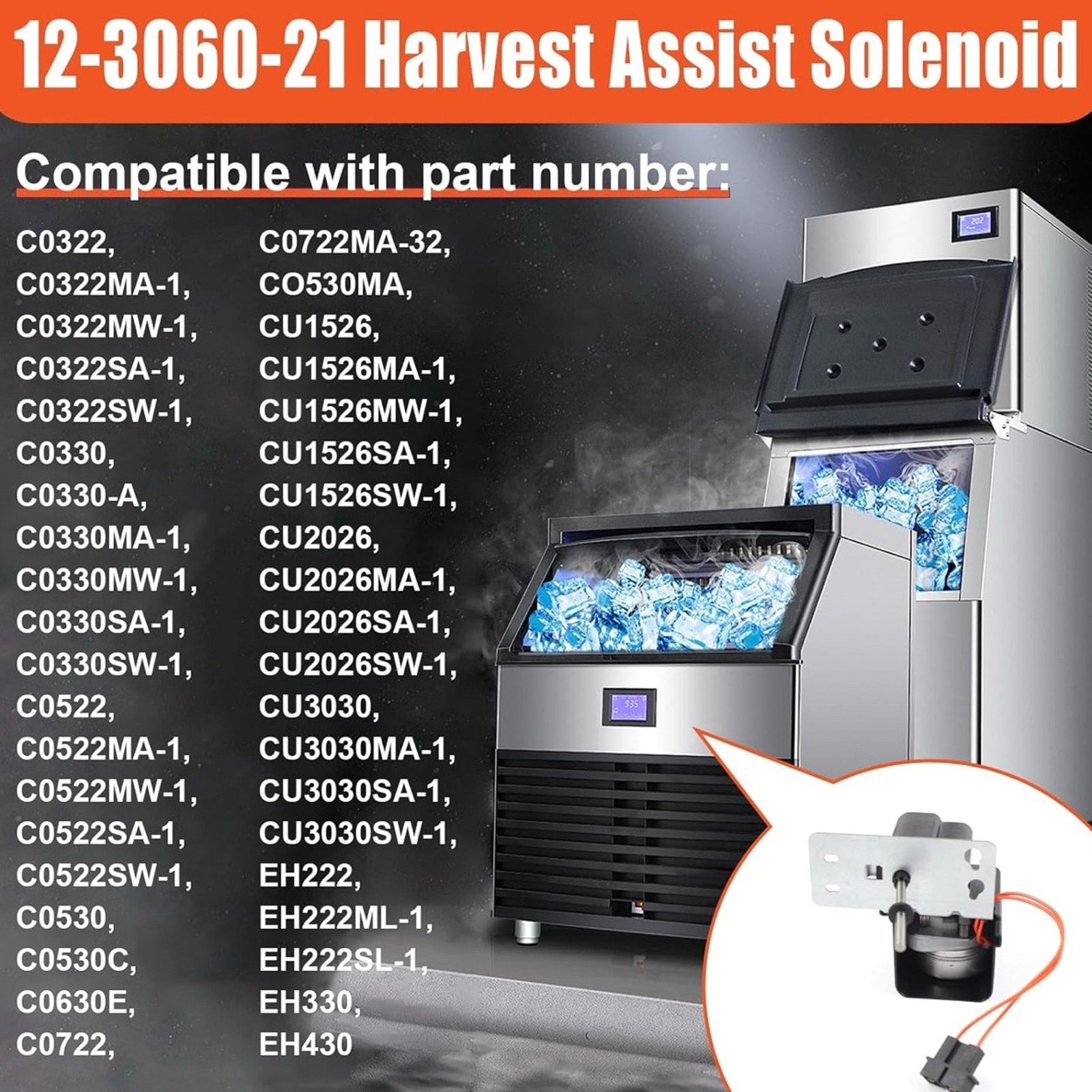 Compatibility - The ice systems 12-3060-21 harvest assist is compatible with model number : C0322, C0322MA-1, C0322MW-1, C0322SA-1, C0322SW-1, C0330, C0330-A, C0330MA-1, C0330MW-1, C0330SA-1, C0330SW-1, C0522, C0522MA-1, C0522MW-1, C0522SA-1, C0522SW-1, C0530, C0530-C, C0630-E, C0722, C0722MA-32, CO530MA, CU1526, CU1526MA-1, CU1526MW-1, CU1526SA-1, CU1526SW-1, CU2026, CU2026MA-1, CU2026SA-1, CU2026SW-1, CU3030, CU3030MA-1, CU3030SA-1, CU3030SW-1, EH222, EH222ML-1, EH222SL-1, EH330, EH430