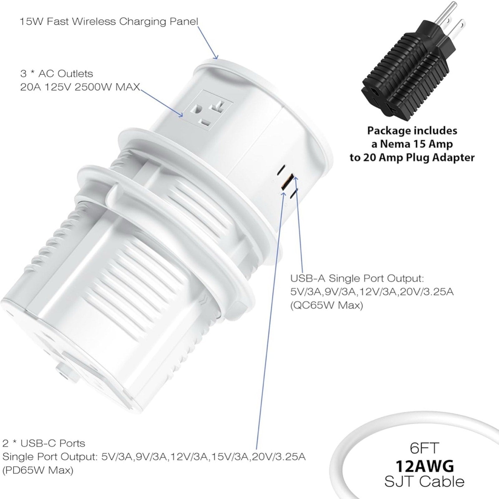 20 Amp Pop Up Countertop Outlet w/ 15W Wireless Charger,Max 65W Power Delivery,4
