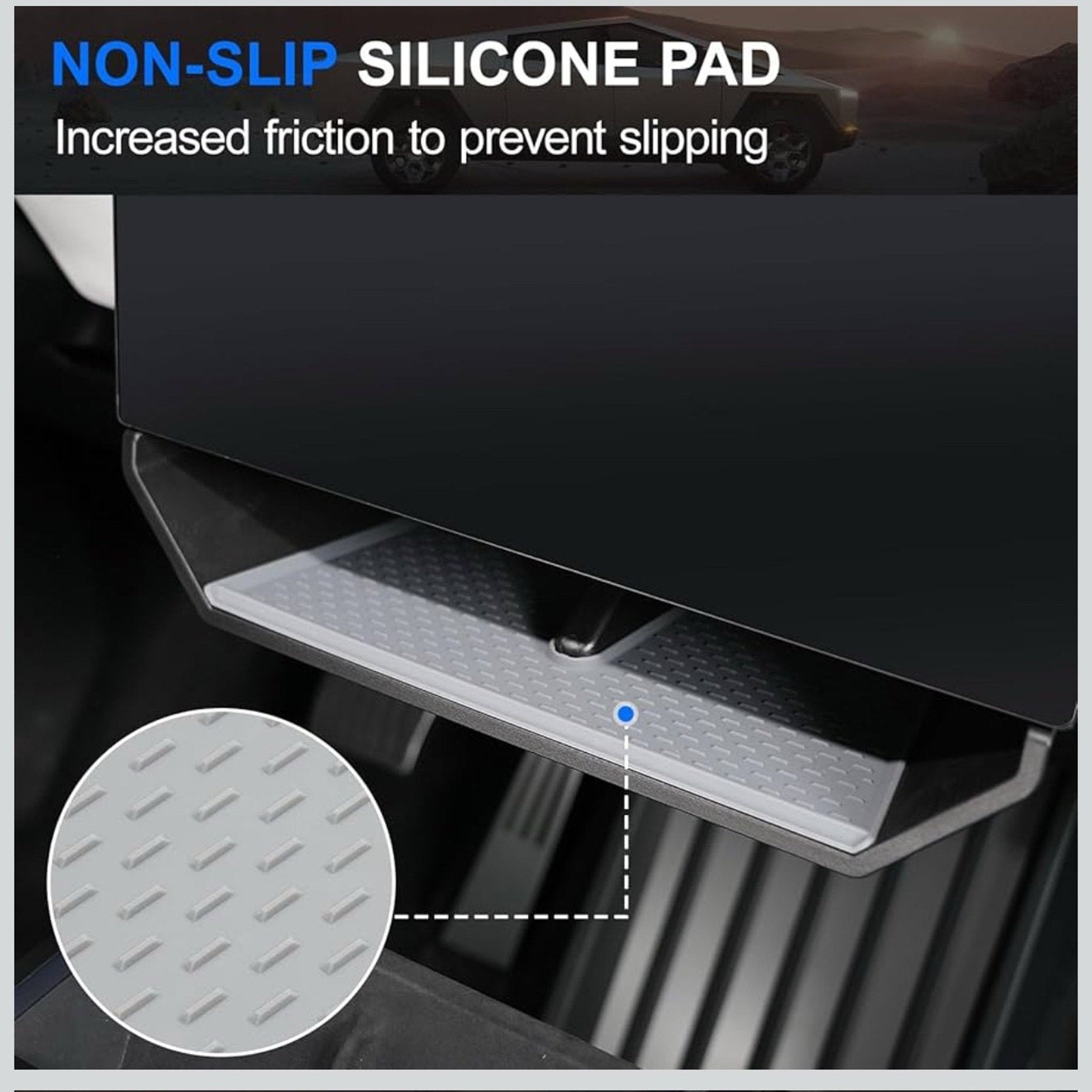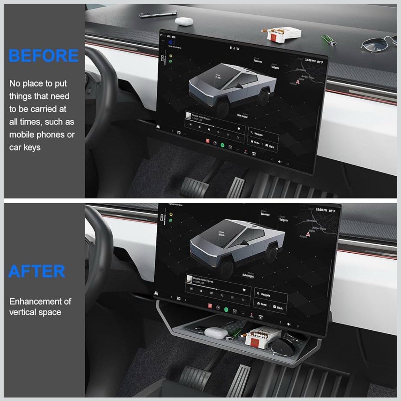 VERSATILE AND SPACIOUS STORAGE: With ample room to store everything from phones, licenses and keys to masks, and tissues, this under screen storage tray for Cybertruck maximizes storage while keeping essentials organized and within reach