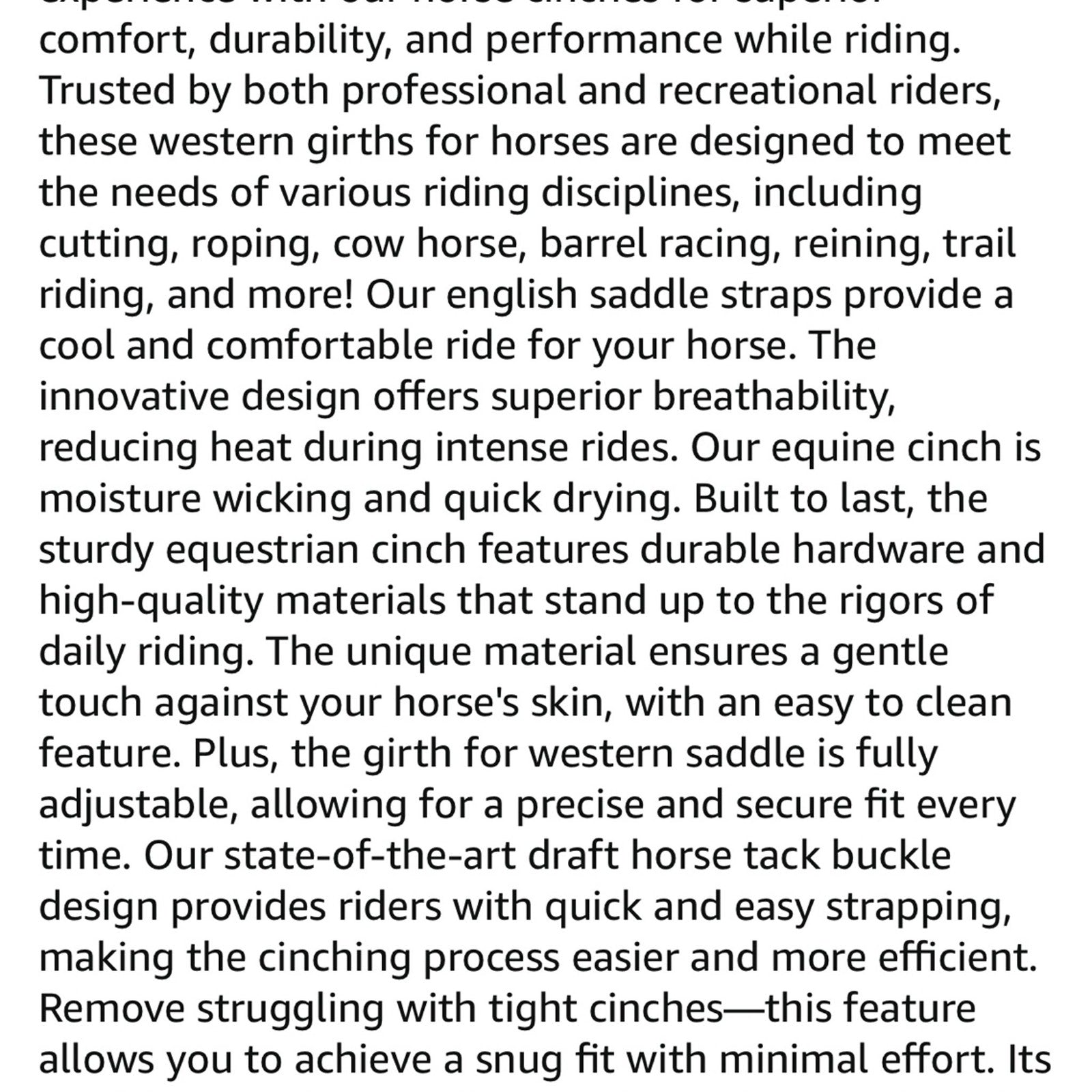 Trusted by Professionals Recreational Riders: The draft horse cinch is a favorite among all riders for a cool, comfortable ride; the horse girth cinch is ideal for many riding needs, from cutting and roping to trail riding and barrel racing
