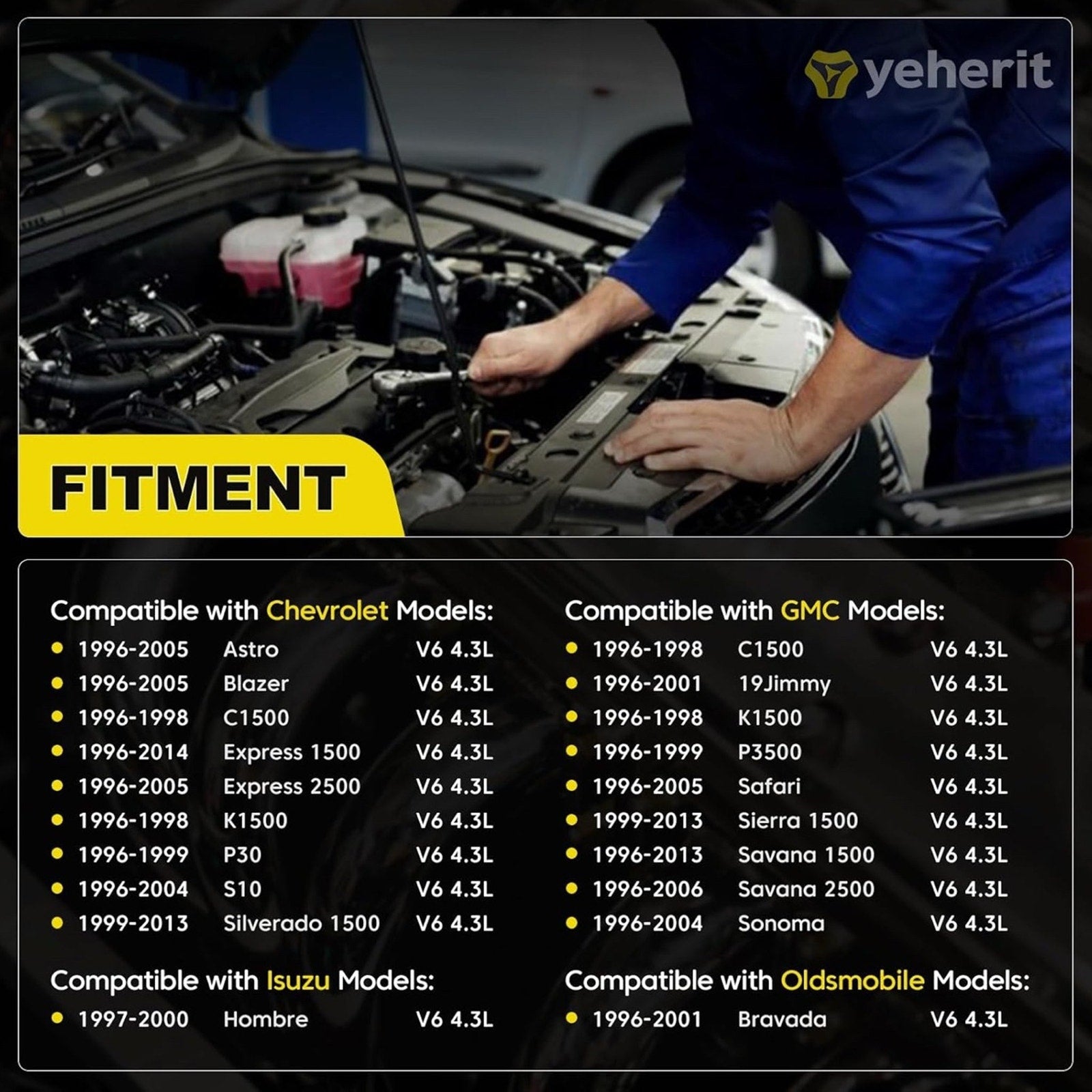 [Fitment-2]: Compatible with GMC 1996-1998 C1500 V6 4.3L,1996-2001 Jimmy V6 4.3L, 1996-1998 K1500 V6 4.3L, 1996-1999 P3500 V6 4.3L, 1996-2005 Safari V6 4.3L, 1999-2013 Sierra 1500 V6 4.3L, 1996-2013 Savana 1500 V6 4.3L, 1996-2006 Savana 2500 V6 4.3L (NOT for 5.3L 6.0L 4.8L), 1996-2004 Sonoma V6 4.3L; Compatible with 1996-2001 Oldsmobile Brava