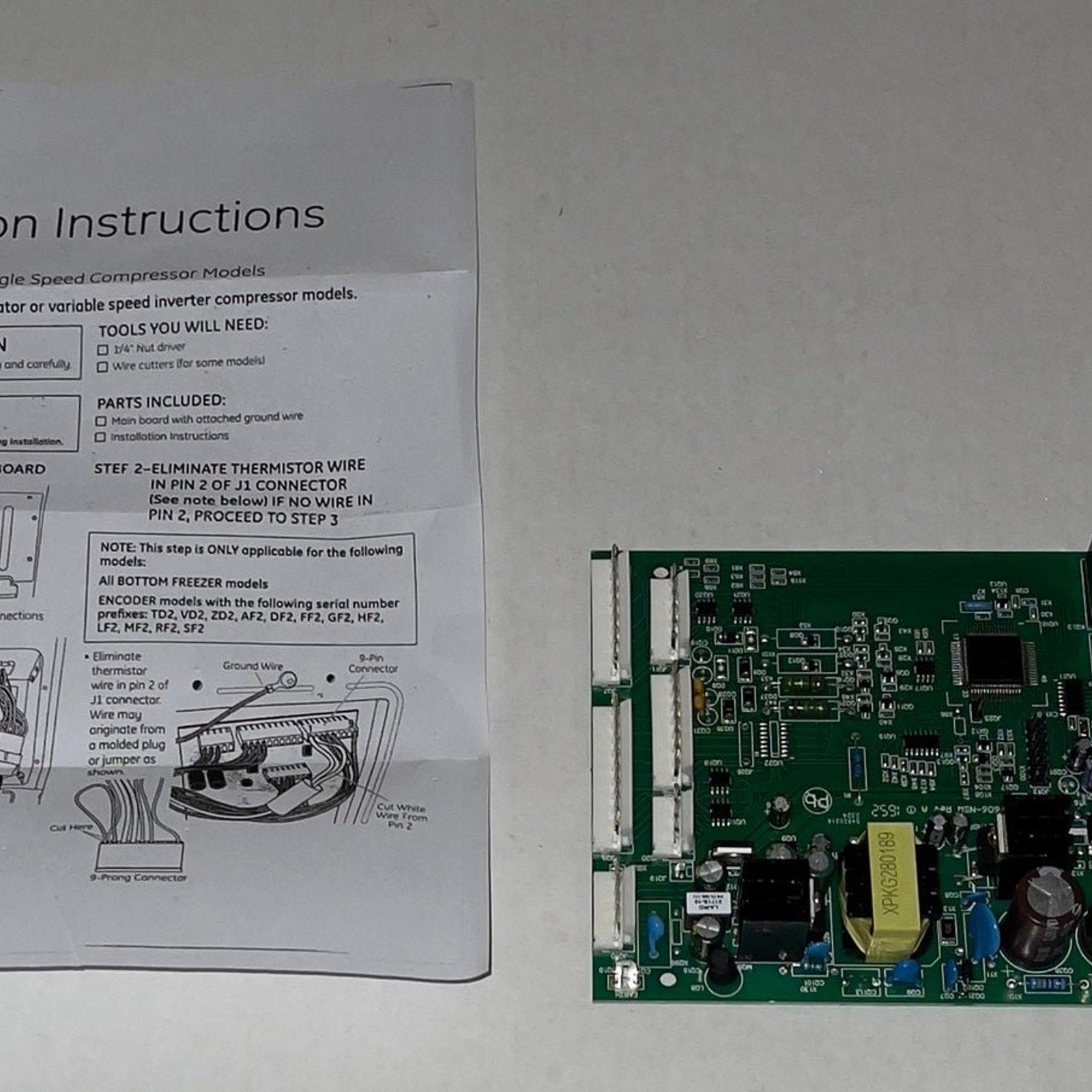 This electronic board (Main Control Board Assembly, Control Board, Motherboard) controls the temperature and defrost functions of the unit. This control board is located on the back of the refrigerator, and measures 8 inches by 5 inches.