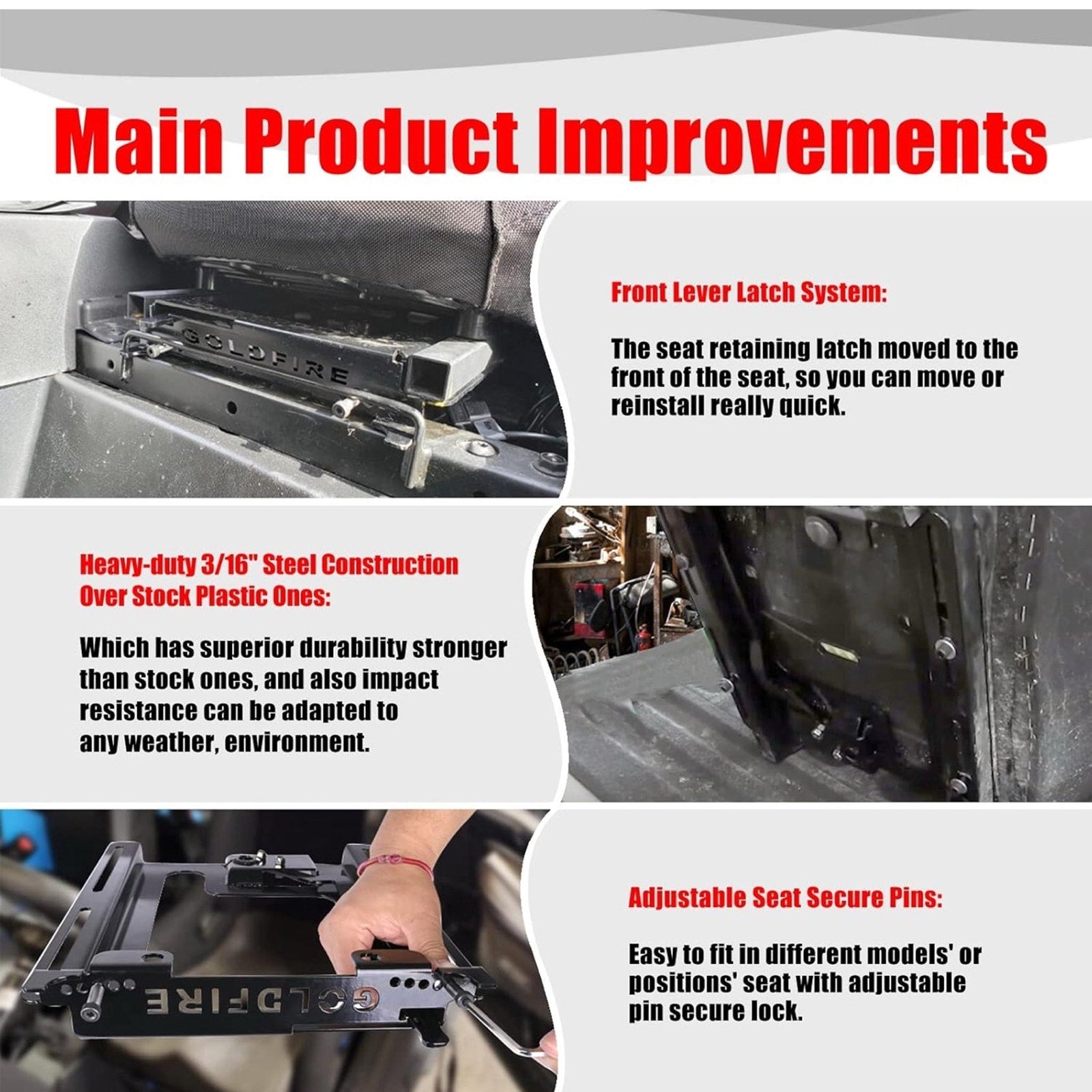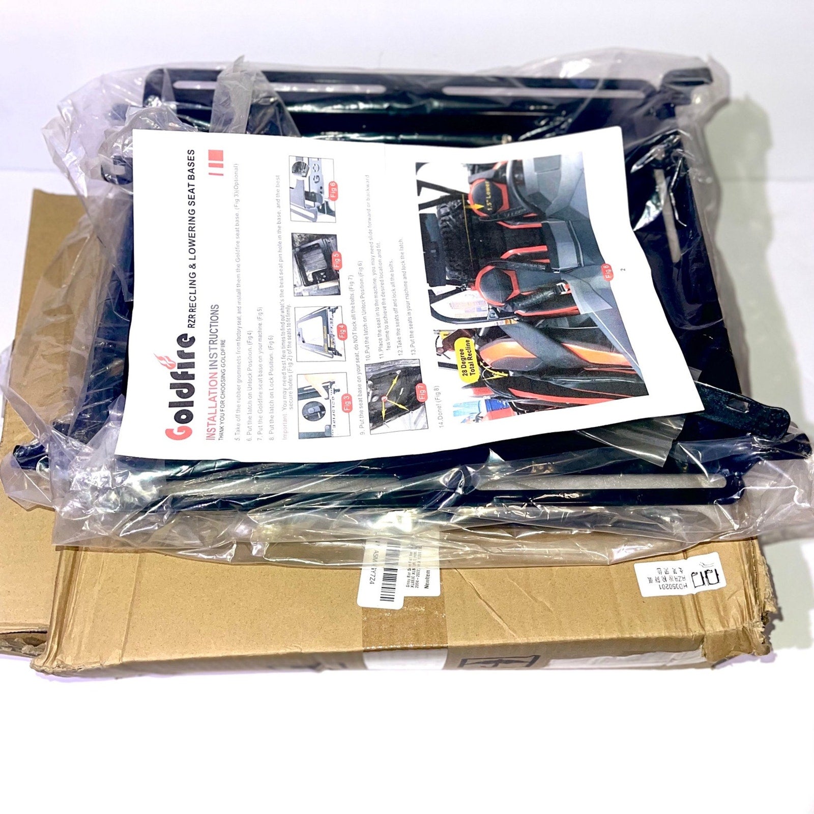 Goldfire RZR Seat Universal RZR Seat Lowering Base 1.5" Recline Seat Drop Brackets Mounts for Polaris RZR 800 / 900 / S 1000 / XP 1000 / XP Turbo /General ModelsAllow you to enjoy your new seating position with the Goldfire RZR Seat Lowering Bases will be 1.5″ lower and recline your seats 6°. It allows you to swap your RZR 570,800,900 seat to RZR 1000 Seats. WARM TIPS: Factory slider is no longer in use!
