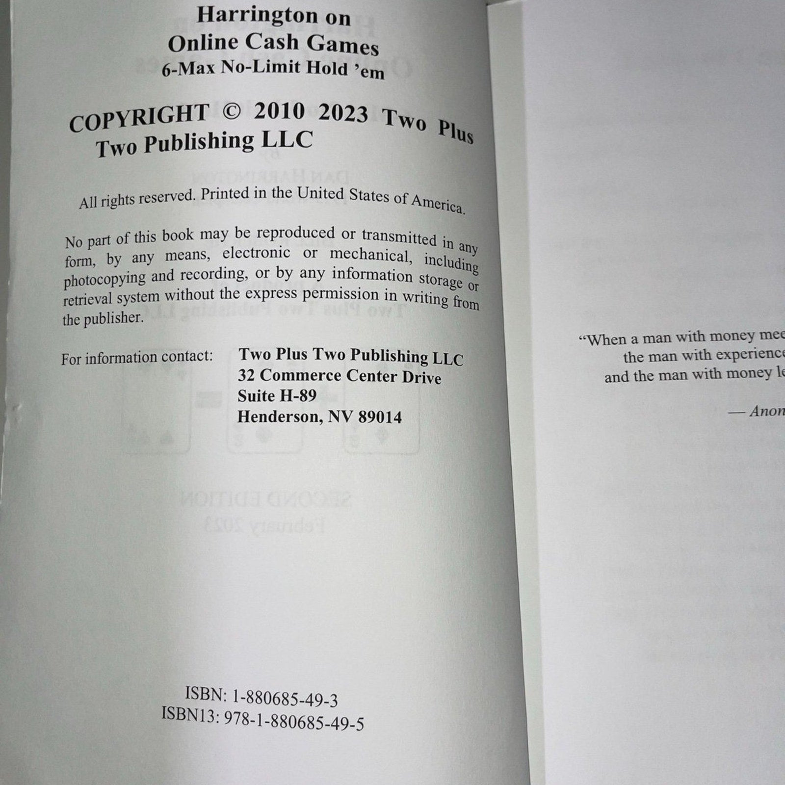 No-limit hold em was once a game played almost exclusively in casinos. But during the last decade, the game s growth has been fueled in part by the easy availability of online playing sites where participants can play cash games and tournaments 24 hours a day, every day. In Harrington on Online Cash Games, Dan Harrington shows you the key ideas and skills that will let you master the online poker world which differs in some significant ways from the world of casino games. You ll learn how to handle different stack sizes, how to play at 6-max tables, how to deal with increased levels of aggression, and how to use the poker databases and heads-up displays that give you unprecedented information on your opponent s tendencie