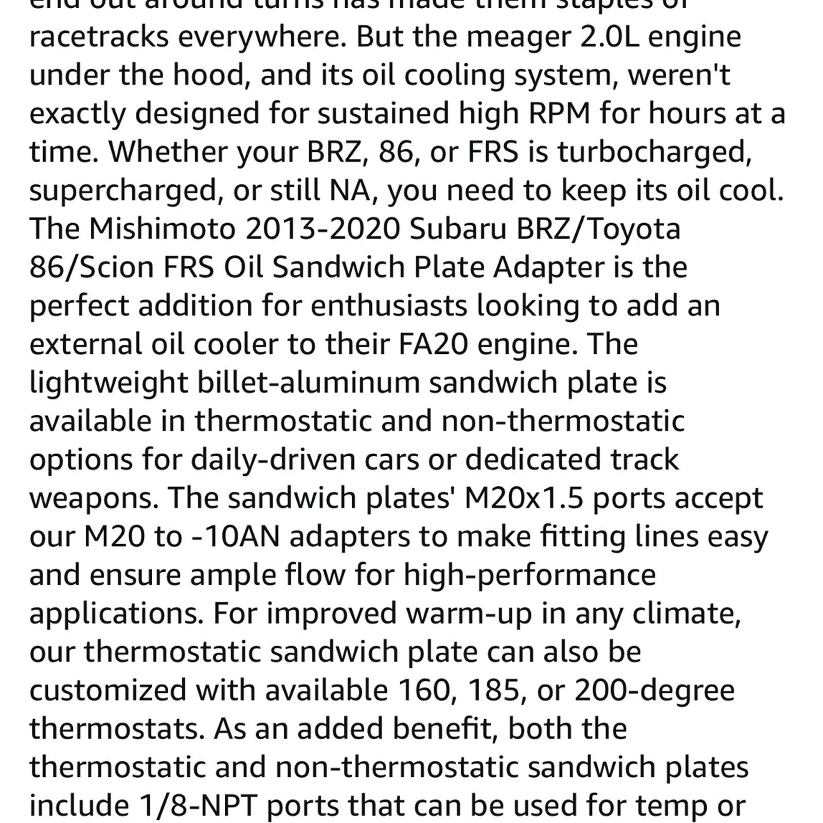 The 2013-2020 Subaru BRZ, Toyota 86, and Scion FRS are some of the most fun you can have on the street without being arrested. Their eagerness to kick the tail end out around turns has made them staples of racetracks everywhere. But the meager 2.0L engine under the hood, and its oil cooling system, weren't exactly designed for sustained high RPM for hours at a time. Whether your BRZ, 86, or FRS is turbocharged, supercharged, or still NA, you need to keep its oil cool. The Mishimoto 2013-2020 Subaru BRZ/Toyota 86/Scion FRS Oil Sandwich Plate Adapter is the perfect addition for enthusiasts looking to add a