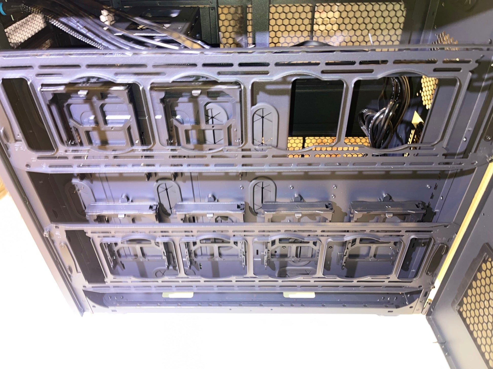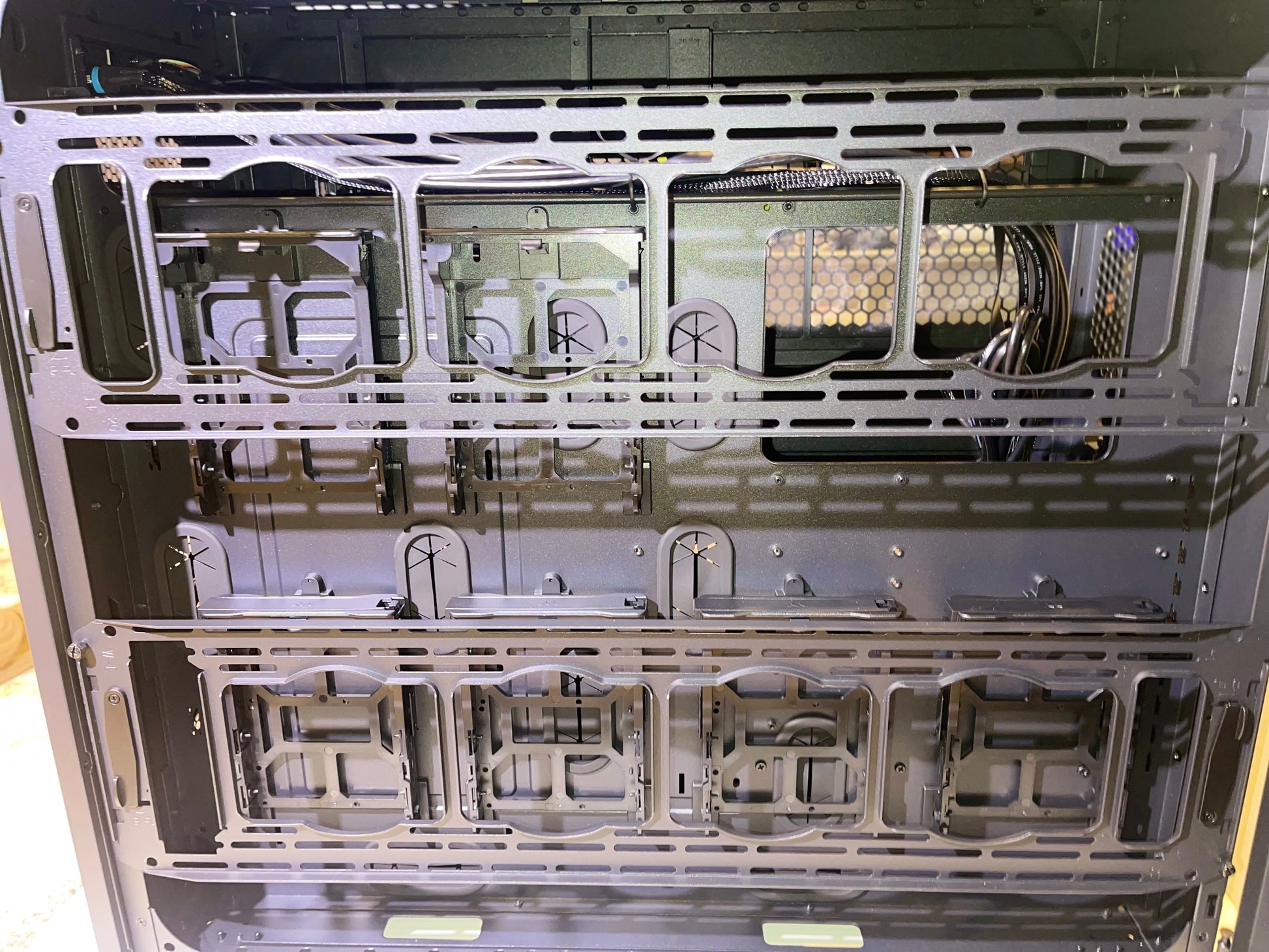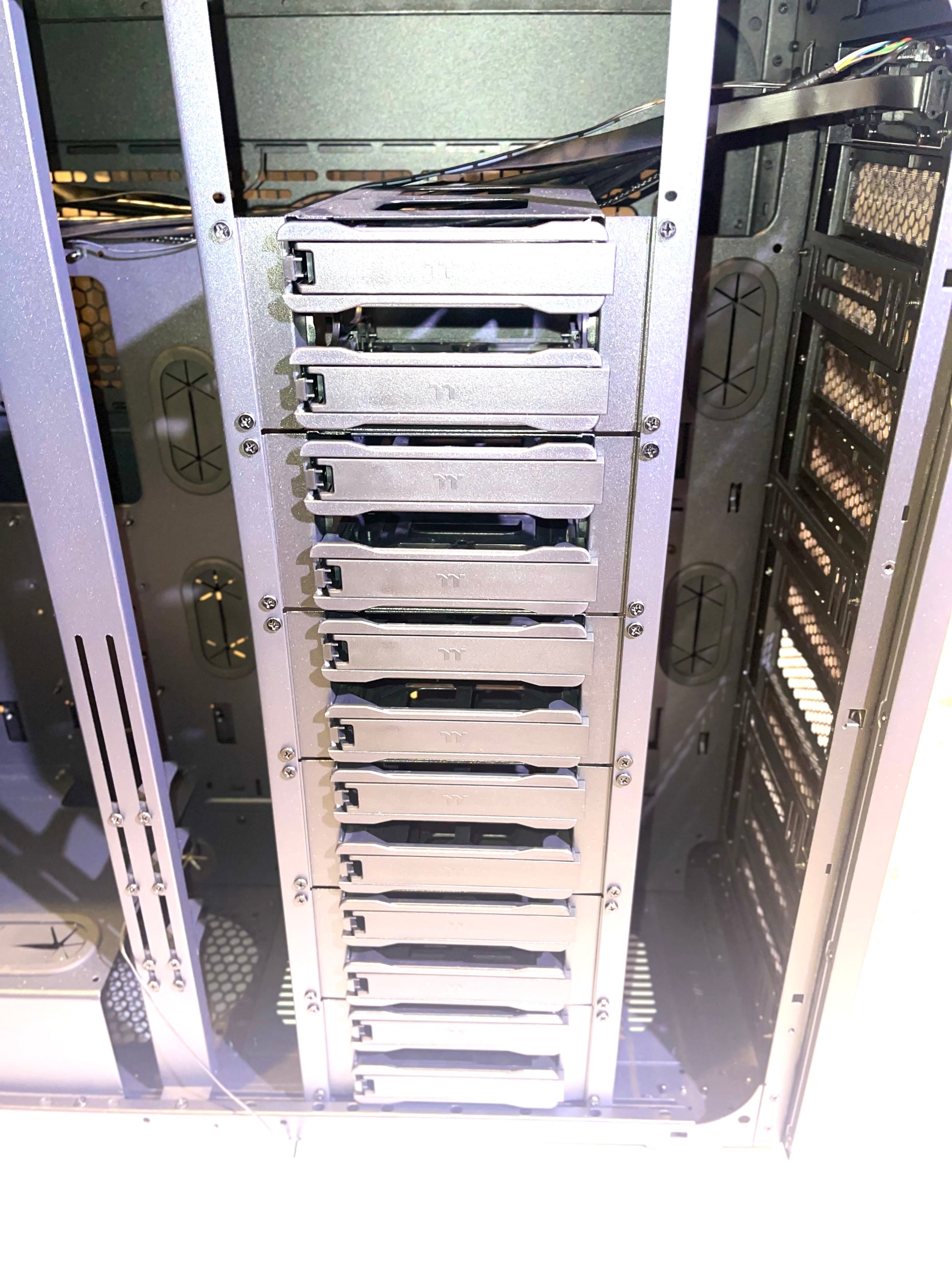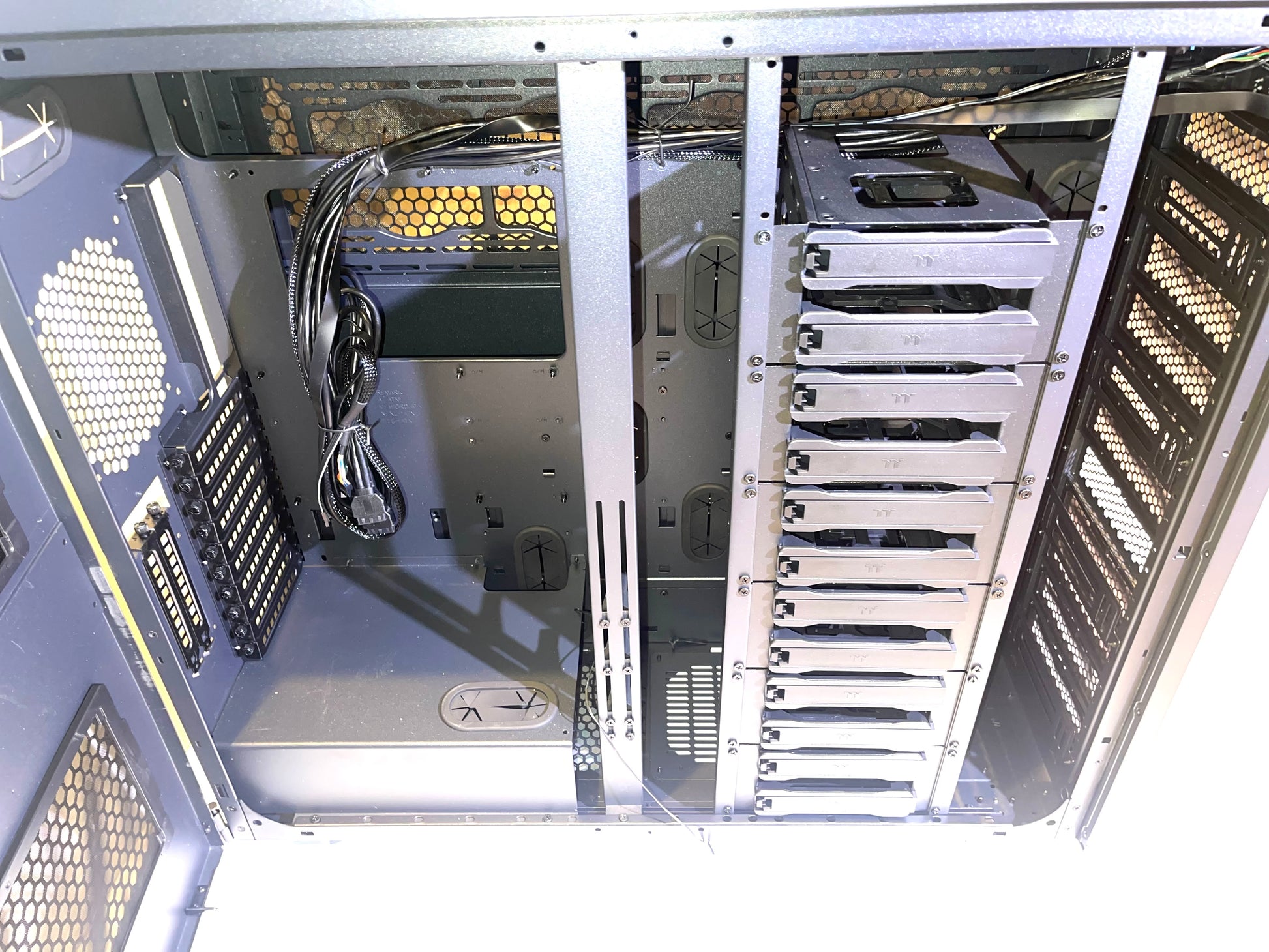 【Plentiful Storage】 Up to 18 HDD Trays for drives 3.5" or 2.5" in size. Twelve located in main chamber cages and an additional 6 trays behind the M/B Tray.