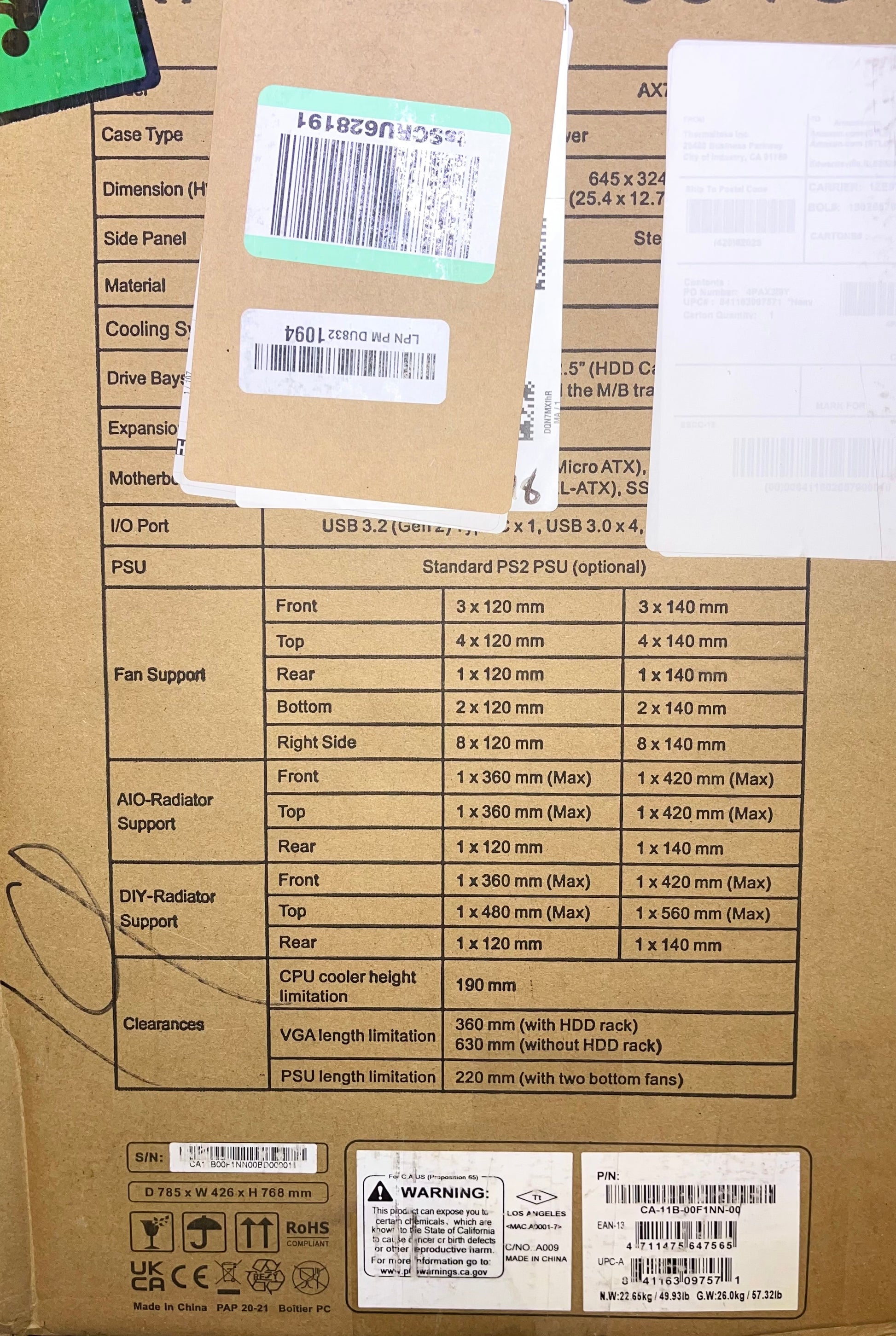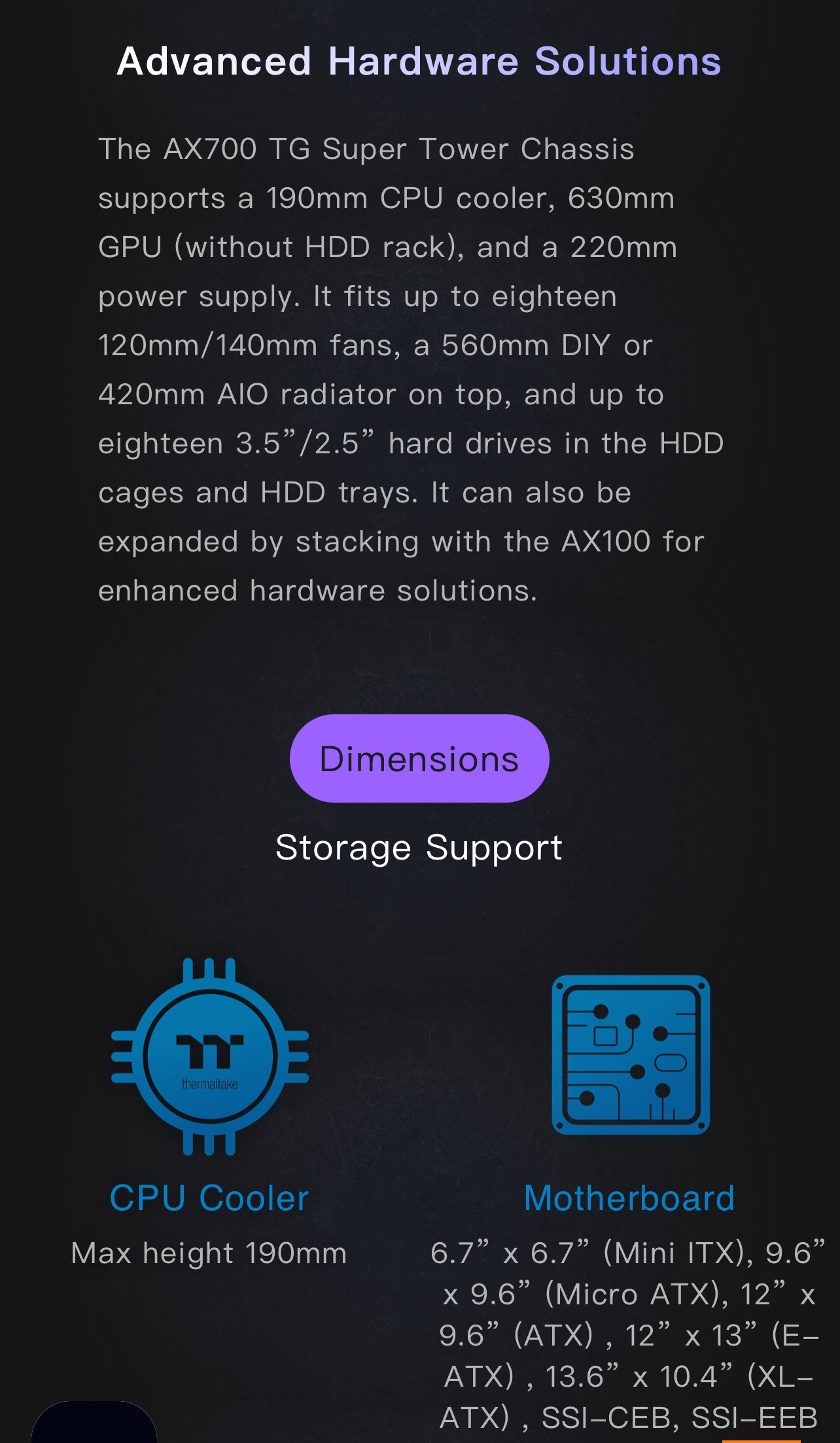 Thermaltake AX700 Super Tower; SSI-CEB/SSI-EEB/XL-ATX/E-ATX; 560mm Radiator Support; 360mm-630mm GPU Clearance; Support for up to 18x 3.5 or 2.5"; Supports 2X 5.25; CA-11B-00F1NN-00 Brand Thermaltake Motherboard Compatability Extended ATX, Server ATX, AT